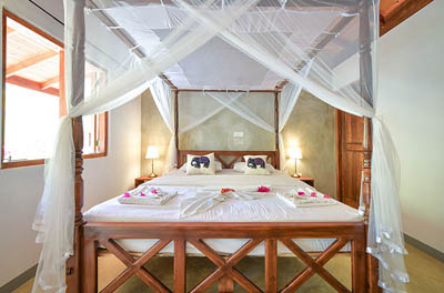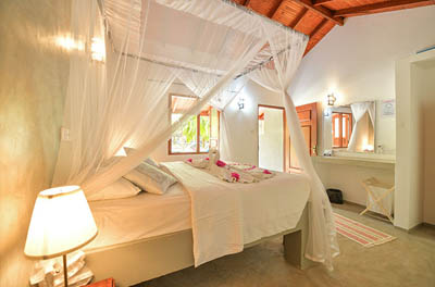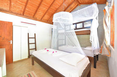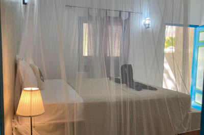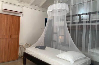 You find a cosy bed with Mosiquito-net, a cupboard, a bathroom with shower and a terrace in front of the room with garden for your own refudge.